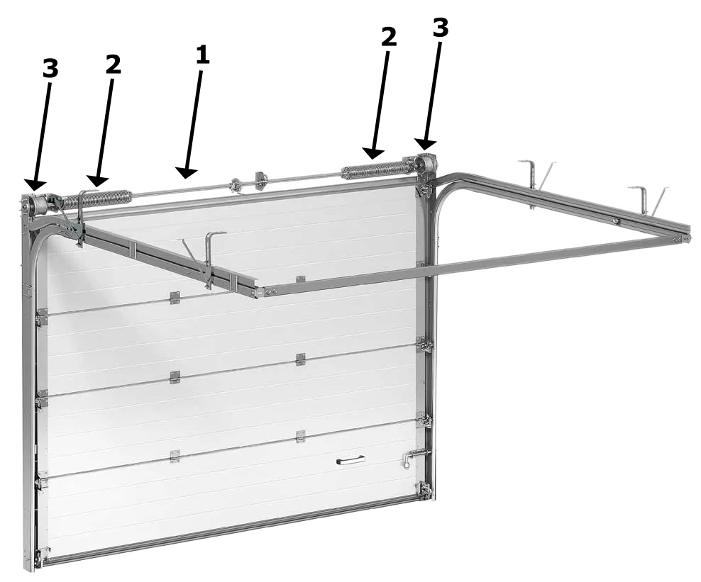 Dla wygody możesz naciągnąć sprężynę na jeden obrót, co pozwoli zobaczyć, która lina jest dłuższa, i wyrównać je. Upewnij się, że liny znajdują się w rowkach bębnów i są prawidłowo zamocowane na dolnych wspornikach. W przypadku nierównomiernego napięcia lin podczas ruchu brama będzie się przekrzywiać i nie będzie działać prawidłowo. Dłuższa lina będzie miała mniejsze napięcie i może wypadać z rowków bębna.